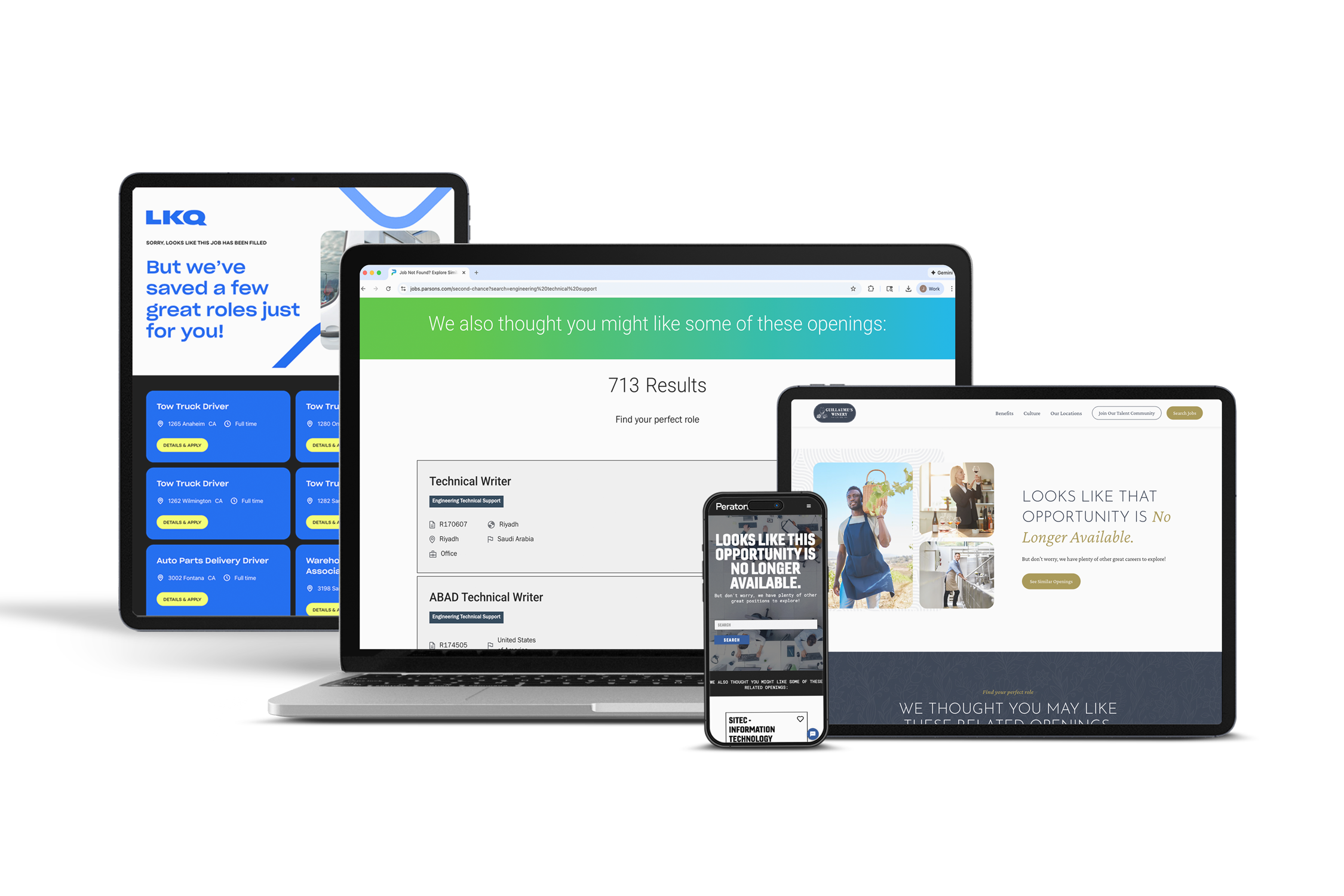 Automatically serve candidates relevant alternatives based on job title, category, location, and other criteria. No dead ends. No lost talent.